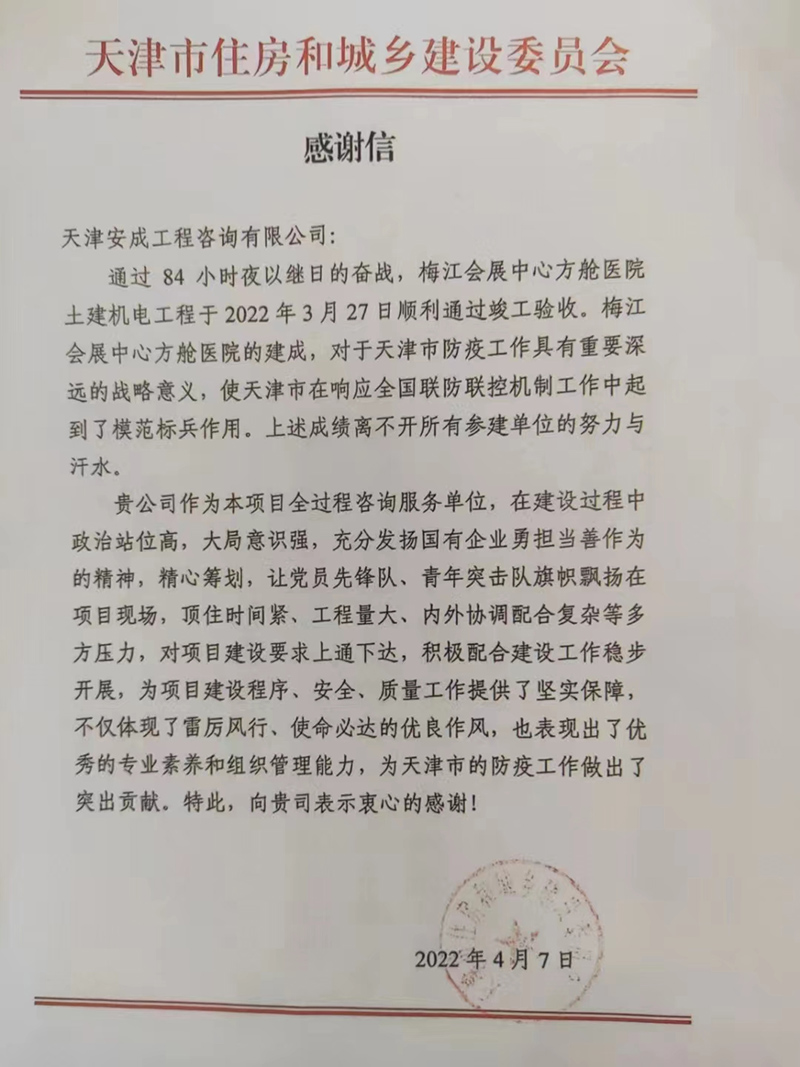 經(jīng)過(guò)84小時(shí)夜以繼日的奮戰(zhàn),梅江會(huì)展中心土建機(jī)電工程于2022年3月27日順利通過(guò)竣工驗(yàn)收。4月7日,天津市住房和城鄉(xiāng)建設(shè)委員會(huì)向安成公司發(fā)來(lái)感謝信,對(duì)安成公司在項(xiàng)目建設(shè)過(guò)程中體現(xiàn)出的雷厲風(fēng)行、使命必達(dá)的優(yōu)良作風(fēng)以及優(yōu)秀的專業(yè)素養(yǎng)和組織管理能力給予了高度認(rèn)可。