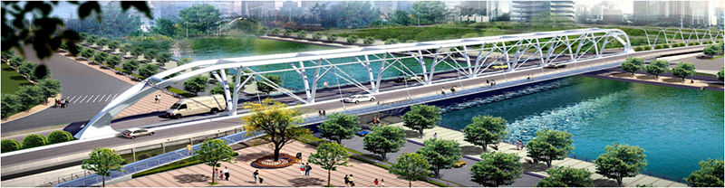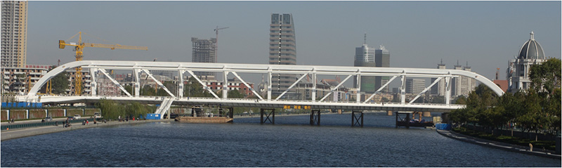 該橋橫跨張自忠路、海河以及海河東路。橋梁總長180米,主跨128米,面積4985.2 平米,為自錨式桁吊組合鋼結構橋。總投資2.65億元。該橋梁設計在國內(nèi)外尚屬首創(chuàng)。